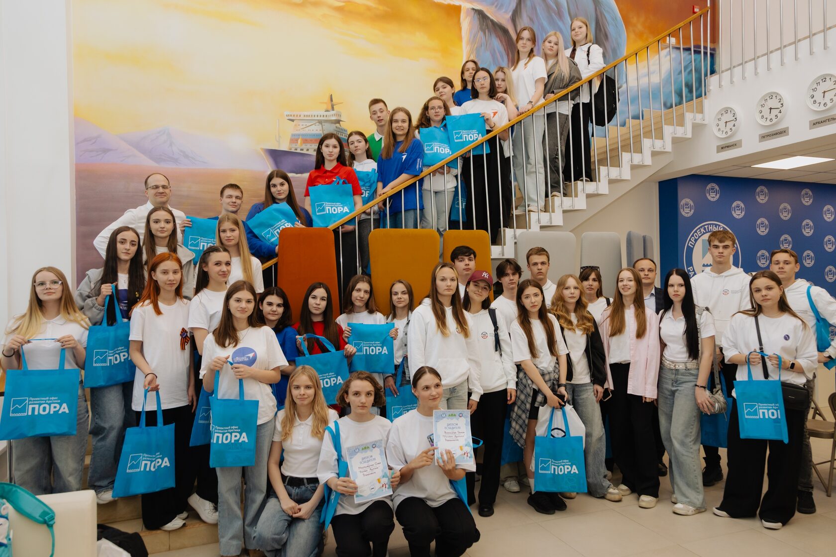 День у ребят получился насыщенный: с вокзала — в гости к «Ассоциации полярников» в музей им. Юрия Сенкевича (помните его легендарный «Клуб путешественников»?). Там ребят ждала экскурсия, лекция и просмотр документального фильма про установку российского флага на дне Северного Ледовитого океана. Следующий в программе был Проектный офис развития Арктики! Там школьники слушали лекцию сенатора Мурманской области Елены Дягеливой, основная тема которой, конечно же, «На Севере — жить!», обменялись презентациями о своих регионах и закрепили все полученные в этот день новые знания в интеллектуальном турнире «Хозяин Арктики». А кто у нас в Арктике хозяин? Конечно, белый медведь!